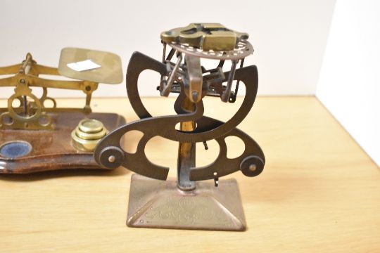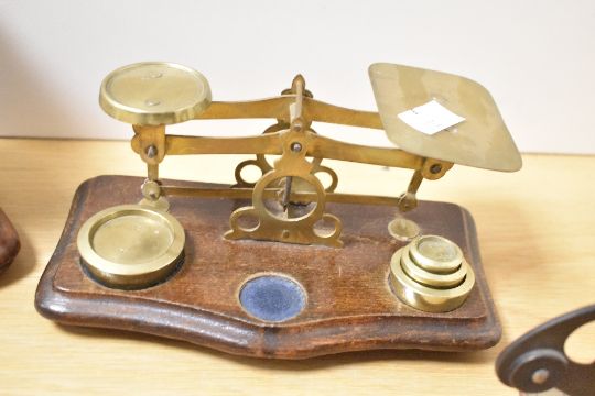 Two 19th to early 20th-century brass and wood postage scales, including a William and Thomas Avery example with brass graduated weights; sold with a metal Columbus Bilateral postal letter scale and a small brass sovereign balance scale, some marked but not all, (4 scales, 8 graduated weights), condition is consistent with age and use, scales both missing a couple of graduated weights, Columbus scale is slightly askew with areas of surface wear across all.