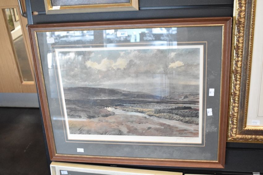 After Joseph Pighills (British 1902 - 1984) Lithograph, depicting a moody upper moorland, signed in pencil to lower right margin, within washline card mount and moulded frame, under glass 50cm x 35cm & 87cm x 54 cm overall. Mould to mount and marks to glass.