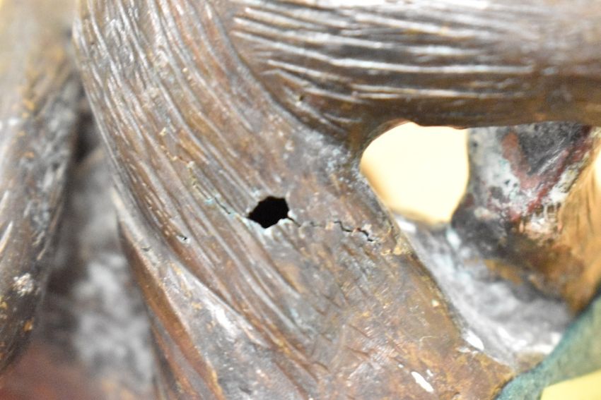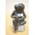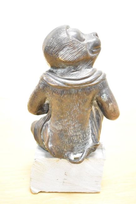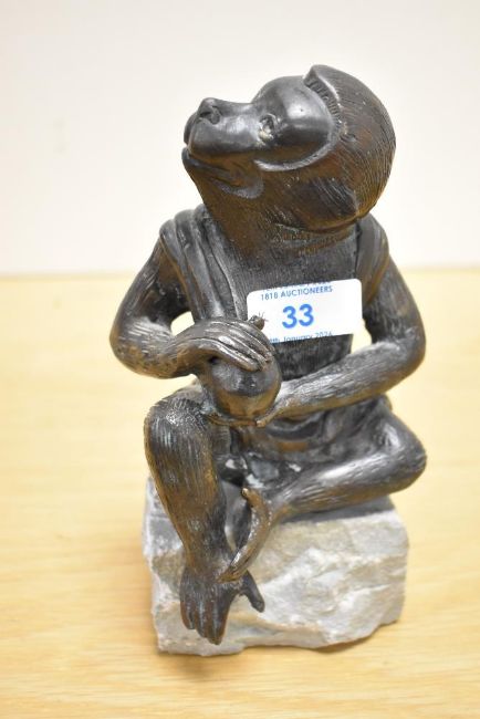 A mid-20th-century Japanese bronze monkey sculpture, presumed to be inspired by the Momotaro folktale from the Meiji period,wearing a traditional robe and clasping an orb-shaped object, the figure features a dark patinated finish and is perched upon a later-added stone base, unmarked, 20cm, damage to the right leg to the thigh in the form of a hole, with similar damage to the right elbow.
