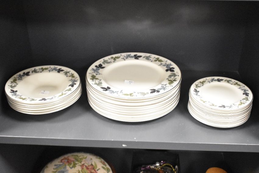 A quantity of 20th-century Royal Doulton translucent china 'Burgundy' tableware, featuring a delicate grape and vine leaf pattern with gilded detailing, to include side plates, plates, shallow bowls, a tureen and serving plates, all marked to base, (approximately 39 pieces), condition is consistent with age and use, some wearing to gilded detailing.