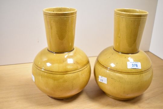 Two 20th-century Dunmore pottery vases, featuring a two-tiered form having a narrow cylindrical top section and a bulbous base, with a deep yellow glaze, both marked to base, both approximately 24cm height, condition is consistent with age and use, small areas of surface wear and a handful of small chips to glaze around base.