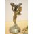 A 20th-century Art Deco-style patinated spelter table lamp base, featuring a female figure with raised arms holding a fan-shaped element, unmarked, 26cm, condition is consistent with age and use, sold as seen.