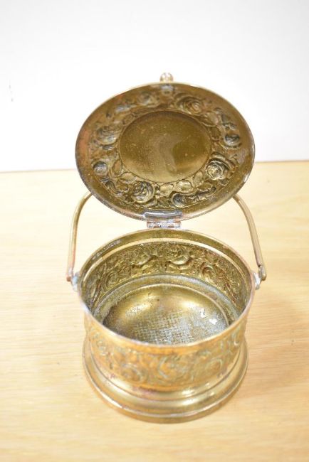 An early 19th-century brass hinged ice bucket, with an etched rose and floral design to lid and sides, unmarked, 11cm.