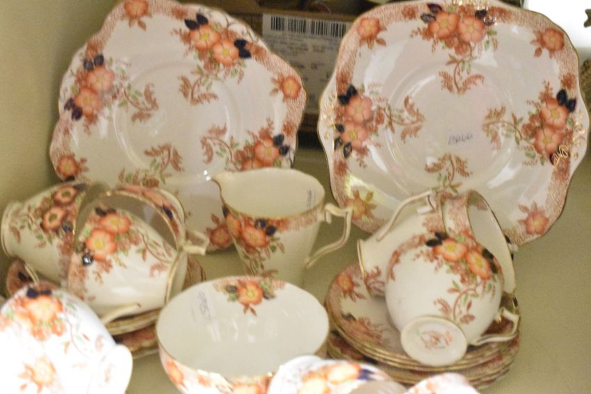 An early 20th-century J.H. Cope & Company, Longton, Wellington China tea set, featuring an Imari-style floral pattern in rust orange and deep cobalt blue, with stylised flowering prunus and rosette motifs, and gilded accents, to include twelve cup and saucer sets, a sugar bowl, jug, and slightly scalloped-edged plates, all marked to the base, (approximately 40 pieces).