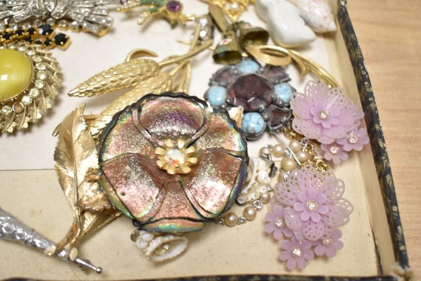 A large assortment of costume brooches, including statement pieces, paste set examples and RAF motifs