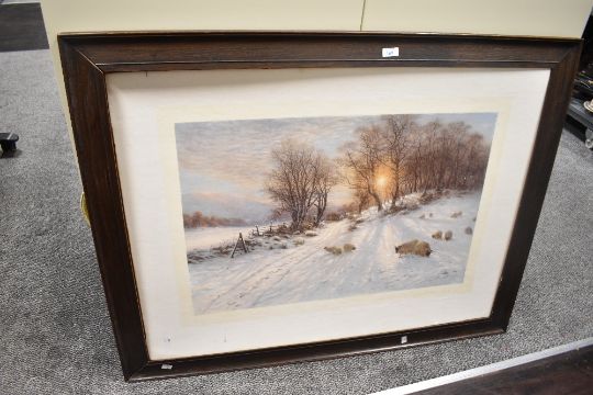 A large 20th-century framed print of 'The Day Was Sloping towards His Western Bower' after Joseph Farquharson (1846-1935), featuring a snow-covered ground, several grazing sheep and a low-hanging, warm sun, 114cm x 88cm, condition is consistent with age and use, print coming away from frame as frame is separating at the top left hand corner.