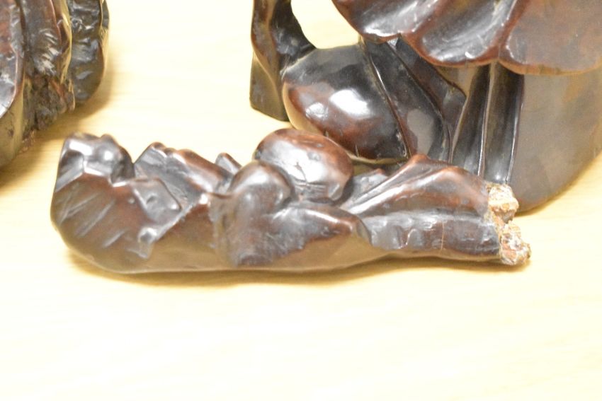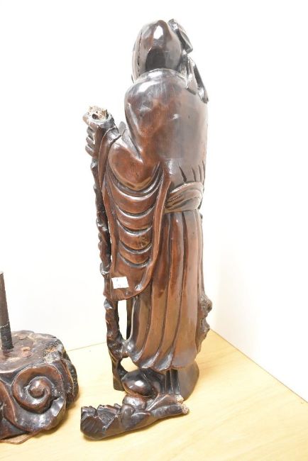 A large Carved Chinese hardwood immortal Shou Hsing, modelled holding a staff and looking to one side, raised on a separate scroll carved wooden base 68cm depletion to staffs surmount (piece present) the base with metal rod and disc rests.