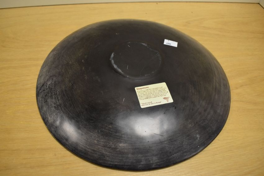 Two decorative 20th-century Kenyan carved soapstone chargers, featuring incised swimming fish details over hand died colourful abstract decoration, one is marked to base, (2), condition is consistent with age and use.