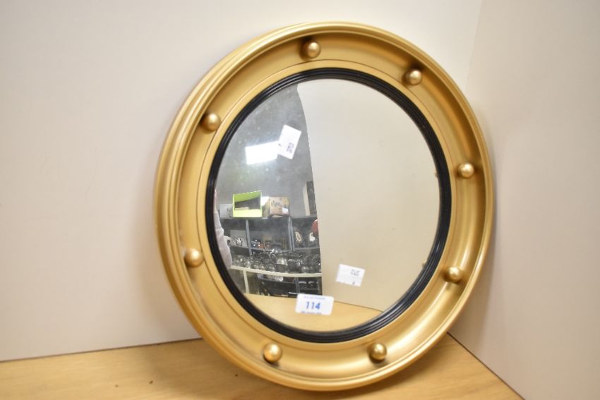 A mid 20th-century gilt framed Regency portholeof convex circular form mirror, featuring a series of decorative spheres to the rim, having wall-hanging fixture to reverse, 33cm diameter, condition is consistent with age and use.