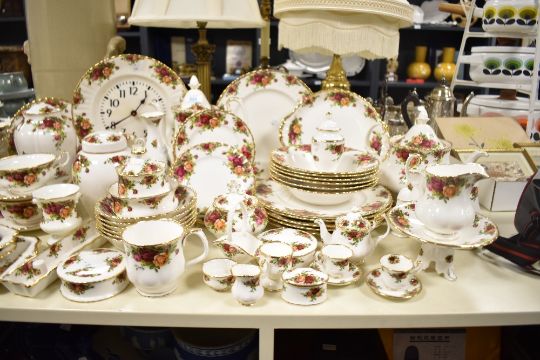 A large quantity of 20th-century Royal Albert bone china 'Country Rose', featuring a delicate rose pattern with gilded detailing, to include cups, suacers, plates, bowls, serving trays, a clock, teapot, ginger jars, bud vases, salt and pepper, milk jug, sugar bowl and much more, all marked to base, (approximately 95 pieces), condition is consistent with age and use.
