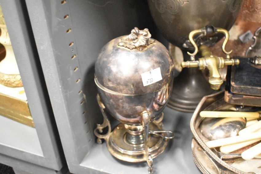 A quantity of 19th to 20th-century metalware, to include a Kerr and Phillips of Sheffield carving set with white metal mounts and antler handles; an ornate silver plate egg-shaped egg cruet with floral finial; a John Round and Son silver-plated oval-formed tureen; a selection of ivorine, white metal and silver plate cutlery; a miniature pewter tankard and more, some marked but not all, condition is consistent with age and use, visible areas of surface wear and patina.