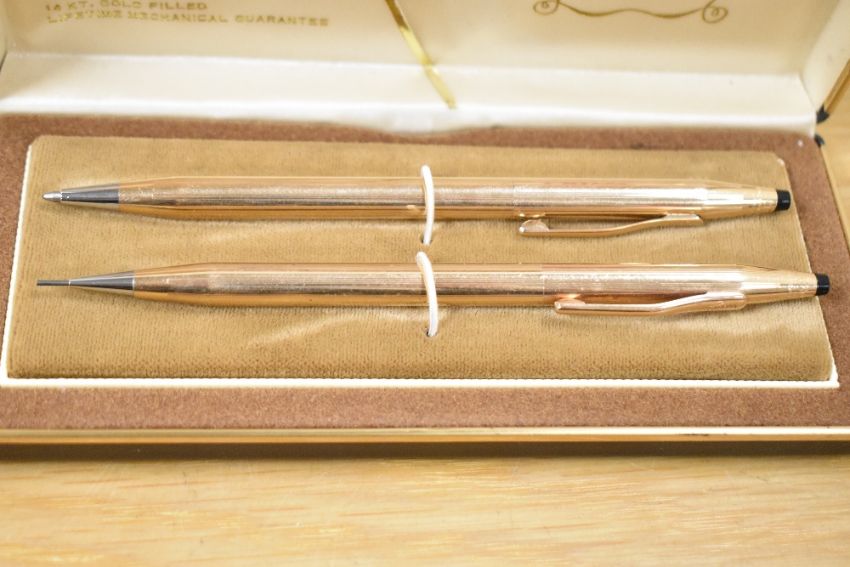 A vintage Cross Classic Century 14k gold-filled pen and pencil set, presented in its original box, featuring a sleek, slim profile with a twist-action mechanism for both the ballpoint pen and mechanical pencil, (2), condition is consistent with age and use.