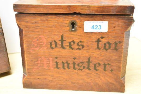 An ecclesiastical oak 'Notes for Minister' box, with raised lancet form back over an slender oblong 'letter' aperture and lockable fall front, marked Notes for Minister' between canted corners 30cm x 18cm x 16cm sold together with a hand held donations/offertory box