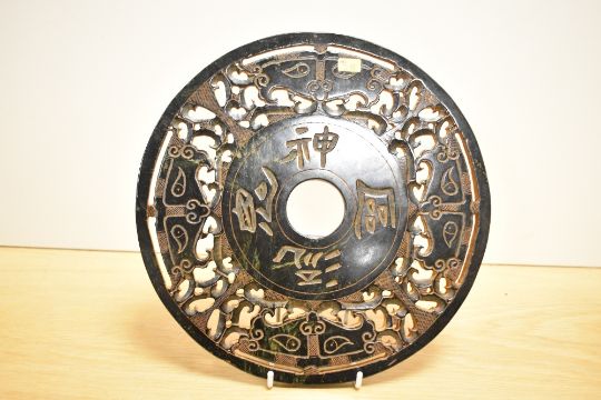 A decorative Chinese carved and pierced black stone Bi/Yubi type disc/carving, of circular form with central roundal aperture within a band of characters and carved and pierced border, 24cm