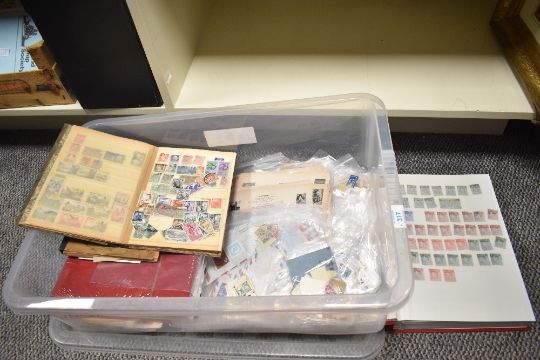 WORLDWIDE - STAMPS IN PACKETS + 3 STOCKBOOKS (64p) ONE UNUSED OTHERS LIGHTLY - Tub with worldwide mix of envelopes and packets, along with two 64 page stockbooks, some contents lightly used, and further stockbook still in shrinkwrap. World and some GB content noted.