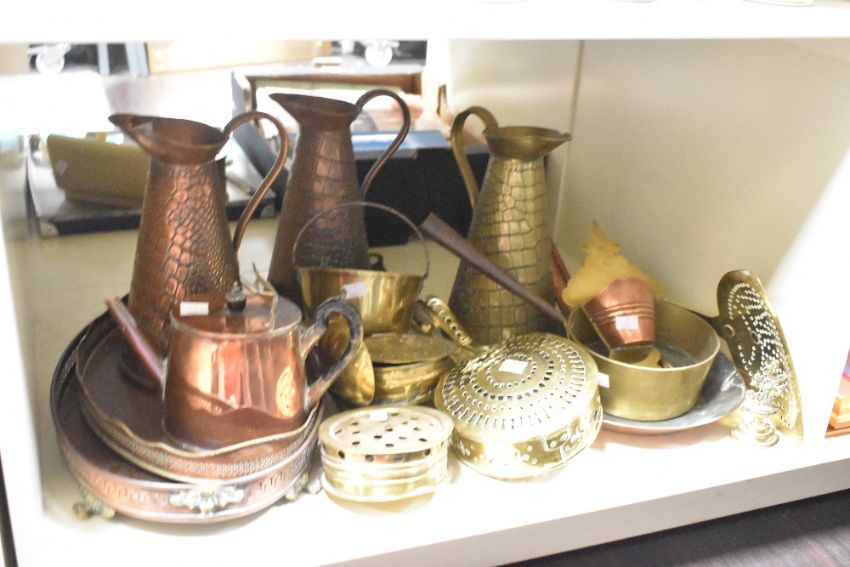 A selection of late 19th to early 20th-century metalware, to include three Joseph Sankey & Sons Limited copper snake-textured ewers; a brass and copper wall sconce; a small brass rose-bud bush formed decorative flat-back; a selection of brass chestnut roasters, a brass pan and more, some marked but not all, (approximately 16), condition is consistent with age and use.