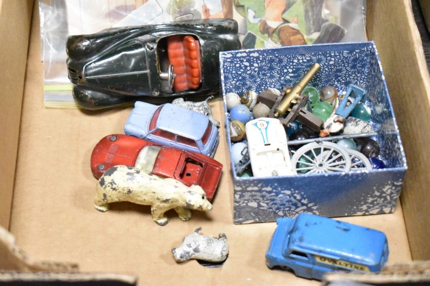 A selection of early to mid-20th-century children's toys, to include two 1930s jigsaws of The Three Little Pigs and the bears from Goldilocks, a box of glass marbles, a selection of miniature metal toy cars to include a Morris Minor, Lotus GT, a Lamborghini Miura, a Dinky Toys Ovaltine van, and more, (14 items, approximately 46 marbles), all metal toys to be in used condition due to play and age.