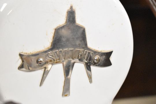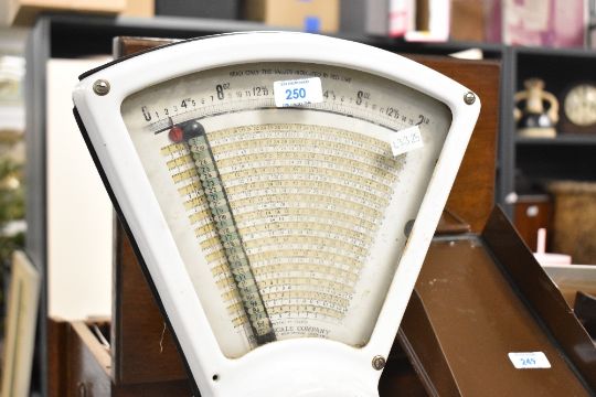 A 20th-century Swift Scale Company white enamelled metal grocers scale, featuring a large analogue model and display dial for weight measurements in pounds, with a metal scale pan, 50cm in height, condition is consistent with age and use, sold as seen.