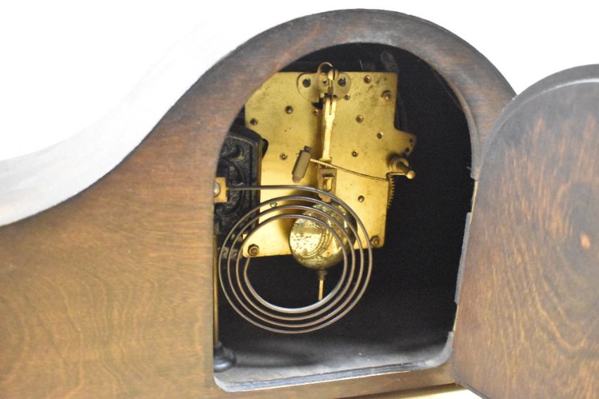 A 1940's oak arched mantel clock, with bead and spindled moulding and Roman hours, the striking movement lacking key but retains it's pendulum 22.5cm x 41cm