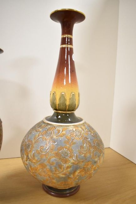 A 20th-century Royal Doulton Lambeth Slaters stoneware vase, by Miss L. Rawlings, of baluster form with a fluted neck and a textured midsection band of floral decoration, marked to the base, markings date the piece between 1902 and 1914, small chip to the leaf motif on the neck, light wear consistent with age; sold with another example by Catherine Francis, of Art Nouveau style and onion form, tapering into a tall, slender neck with a fluted mouth, the upper neck glazed in red and orange, transitioning into a textured floral pattern to the lower section, marked to the base, light wear consistent with age, (2).