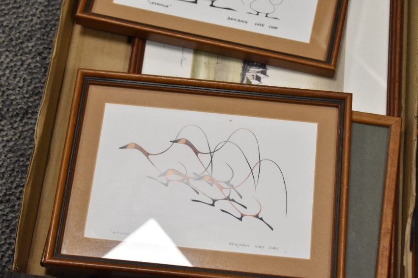 A quantity of 20th-century framed prints, to include a selection of Canadian Goose prints after Benjamin Chee Chee (Canadian, 1944-1977), featuring 'Spring Flight', 'Friends', 'Swallows', 'Learning' and 'Autumn Flight'; sold with two rural scenes, marked to right hand corner, (7), condition is consistent with age and use.