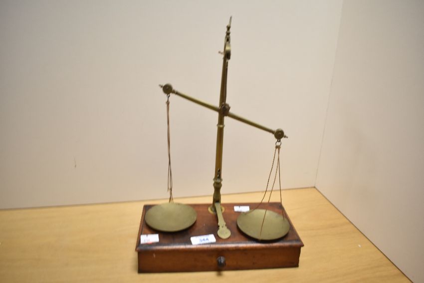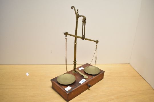 A Victorian Goodbrand and Holland of Manchester apothecary brass balance scale on a wooden base; sold with a quantity of sundry metal weights and coins held within the inner drawer, marked to brass scale, 45cm in height, condition is consistent with age and use.
