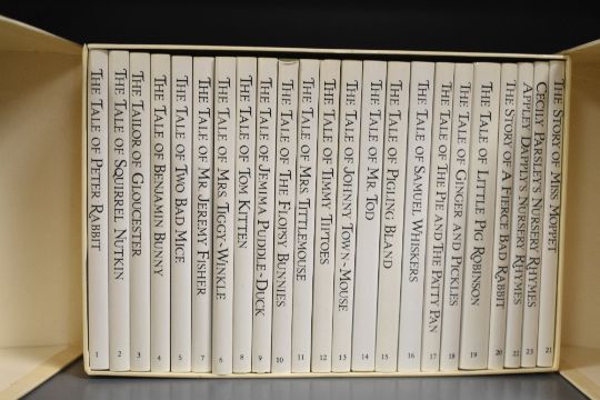A modern The World of Peter Rabbit by Beatrix Potter, the original and authorised edition box set, 1988, using original watercolour illustrations, to include hardback books 1 to 21, featuring titles such as The Tale of Jemima Puddle-Duck, The Tale of Tom Kitten, The Tale of Peter Rabbit, and more, (21), excellent used condition.