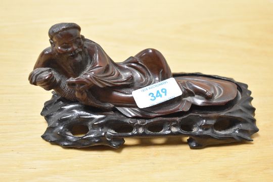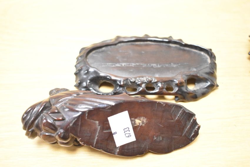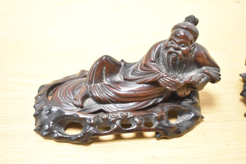 Two 19th/20th-century Chinese carved hardwood figures, possibly depicting God's, marked to base, 12cm and 17cm in length, condition is consistent with age and use, areas or surface wear and dust due to storage, one is chipped near the base of the figures feet.
