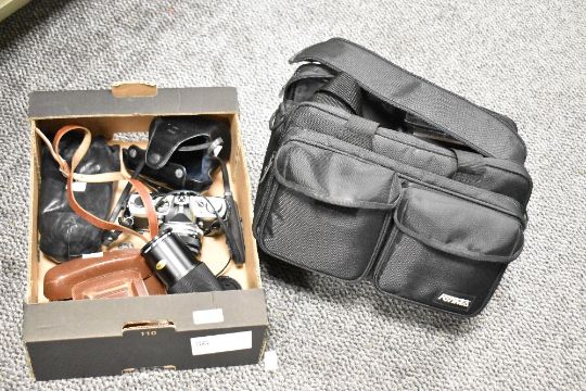 A vintage Olympus OM-1 35mm SLR film camera with a 50mm f/1.8 F.Zuiko Auto-S lens; sold with a Zeiss Ikon Nettar folding film roll camera and a selection of carry cases, (2 cameras, 2 cases, 1 lense), condition consistent with age and use, sold as seen.