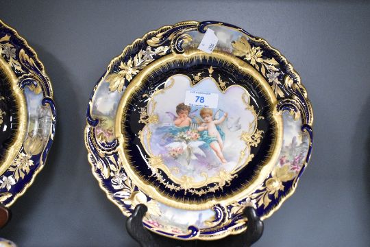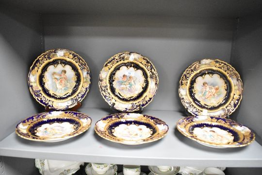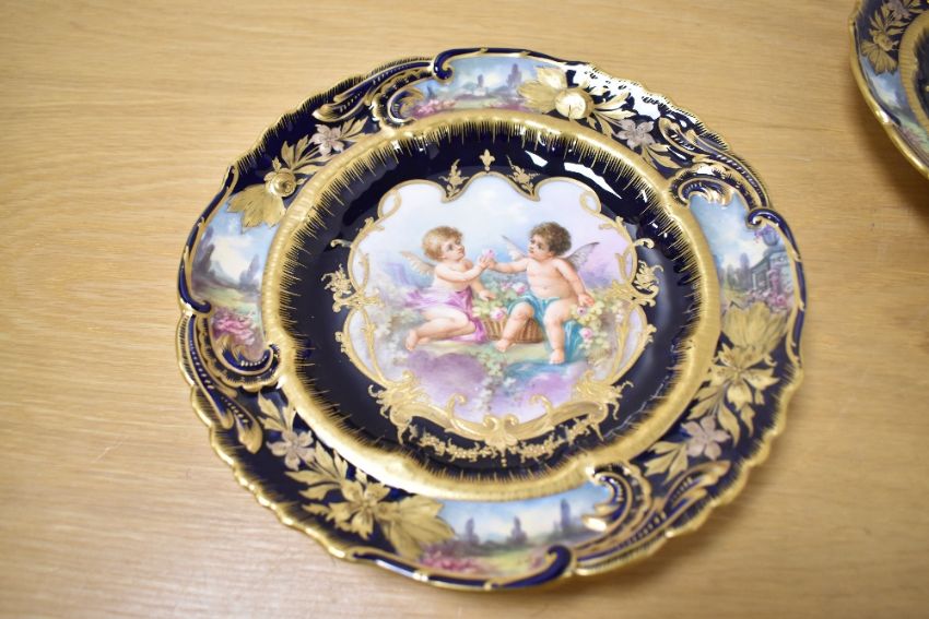 Six presumed 19th-century French Sèvres-style porcelain plates, of a deep cobalt blue, featuring a selection of delicately rendered central vignettes of François Boucher-style cherubs, with heavy ornately scrolled and floral gilding detailing around the centre, and gently scalloped edges, 3 separate markings to base and François Boucher (1703–1770)-style signature to vignettes, (6), approximately 23.5cm diametre, condition is consistent with age and use, slight areas of surface wear to gilding with no visible chips or cracks.