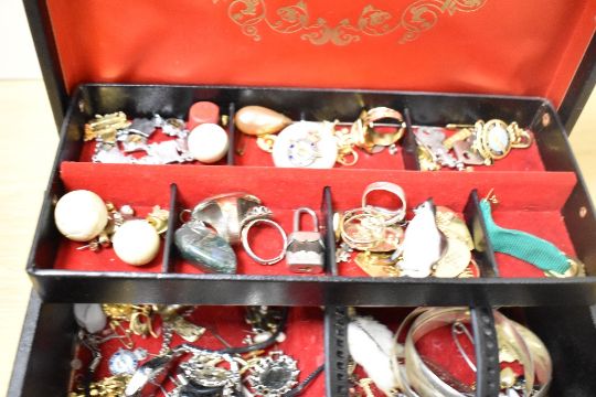 A black faux leather jewellery box, containing an assortment of costume jewellery, including rings, wristwatches, a rabbit foot brooch and earrings