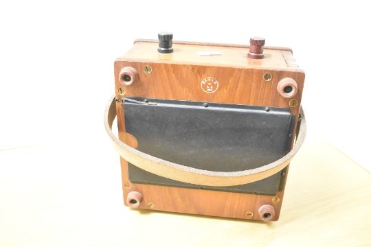 An early 20th-century Evershed and Vignoles Limited moving-coil ammeter for direct currently only, housed in a wooden case with a hinged metal covering, having general instructions and precautions for use printed on an internal label, 9cm x 20cm, condition is consistent with age and use.