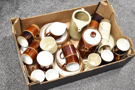 Two 20th-century Poole pottery tea services, featuring Broadstone and Chestnut, to include tea pots, cups and saucers, all marked to base, (approximately 58).