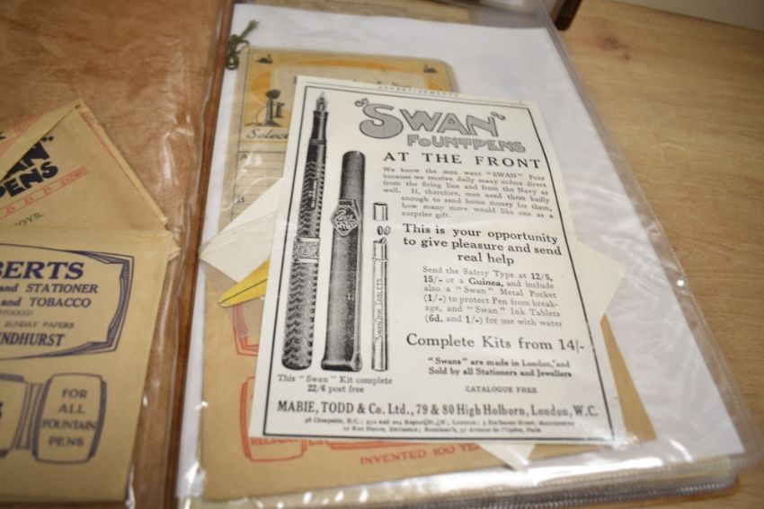 Advertising. Two folders of advertising leaflets, flyers, and booklets as well as writing equipment related Postcards, this includes local interest with the Cumberland Pencil Co Ltd, Keswick. A lot well worth a view