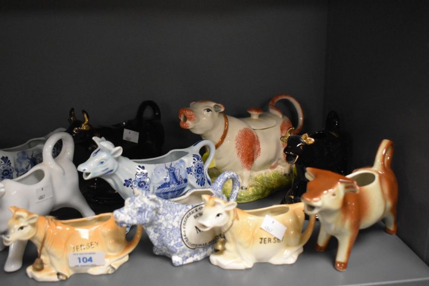A large quantity of 20th-century ceramic cow creamers/milk jugs, to include one small and three large Royal Delft Blue examples; a seated Frederick Rathbone Burgess Pottery transferware example; a large Moorland Pottery Chelsea Works in Burslem example and more, some marked to base but not all, (15), condition is consistent with age and use, a couple of small visible chips to some and a large fixed crack to the neck of one of the 'jersey' cow.