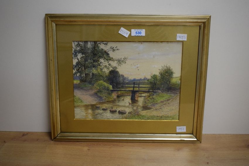 *Local Interest* H.B. Simpson (British 19th Century) watercolour, a countryside river landscape with bridge and stepping stones, signed and dated (1904) lower right, within gilt mount and moulded gilt frame, under glass 28.5cm x 21.5cm & 42cm x 35cm overall. Some foxing.