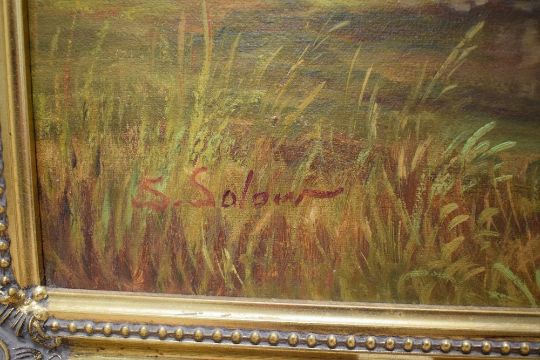 S. Solow (20th century) oil on canvas, rural river cottage scene with figure feeding ducks, signed lower left, within a moulded gilt frame, 49.5cm x 59.5cm & 59cm x 69cm overall.
