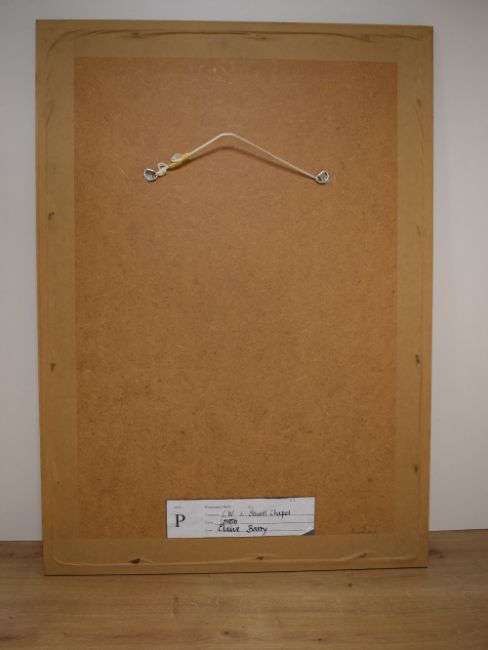 Claire Barry (contemporary) coloured pencil/crayon ecclesiastical study 'School Chapel', unsigned, attribution and titled to label verso, within a stepped card mount, moulded frame, under glass 55cm x 34cm & 72.5cm x 52cm overall slipped within frame.