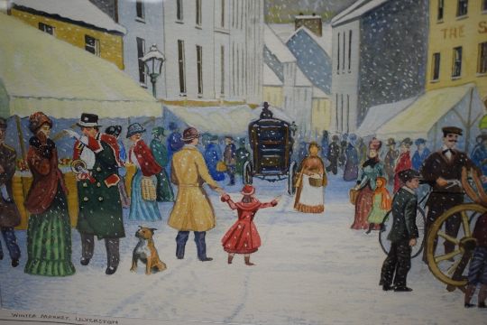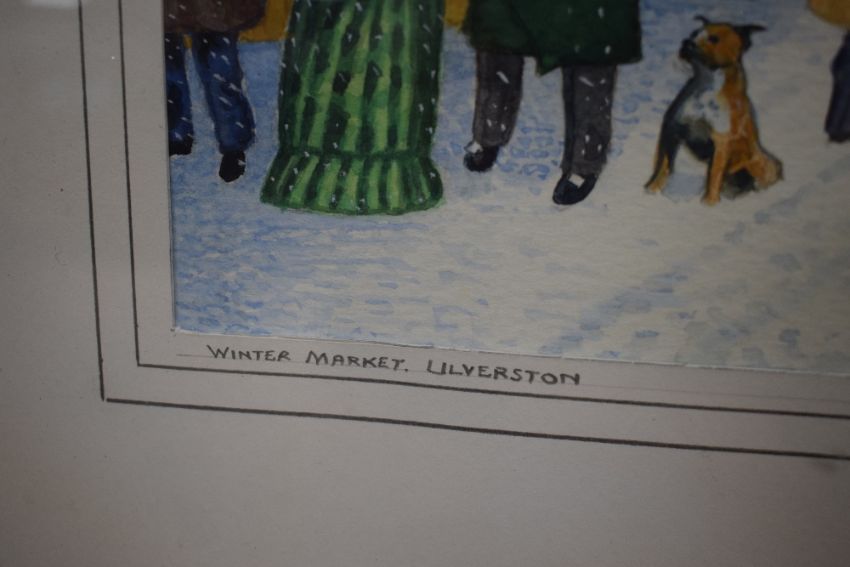 *local Interest* Ken Laidman, watercolour 'Winter Market, Ulverston' depicting the Cumbrian town at Christmas in the 19th century, signed lower right, entitled to margin lower left, within washline mount and moulded frame, 29.5cm x 22cm & 48cm x 38.5cm overall.