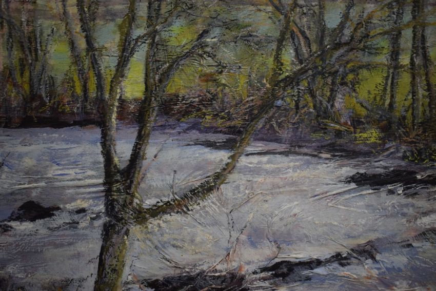 *Local Interest* Jennifer Wheten (British 1941-2021) Acrylic / mixed media on board, a woodland river scene with paper applied and manipulated to create texture, signed lower right, within flat wooden frame, 49cm x 38cm & 57.5cm x 47.5cm overall.