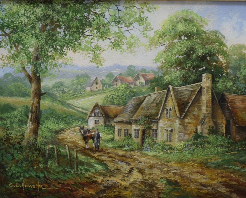 Christopher Howells (British 1947 - 2013) A pair of oils on canvas, depicting a man leading a horse up a rural track with cottages and a rural hamlet of cottages, both signed lower left, within canvas slip and moulded gilt frame 24cm x 19cm & 41cm x 36cm overall