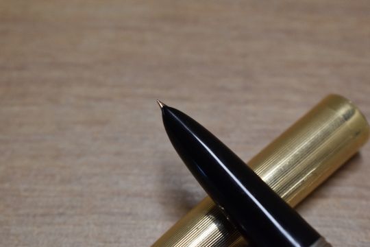 A Parker 51 vacumatic fill fountain pen in Black with Gold fill parallel line cap. Circa 1942.