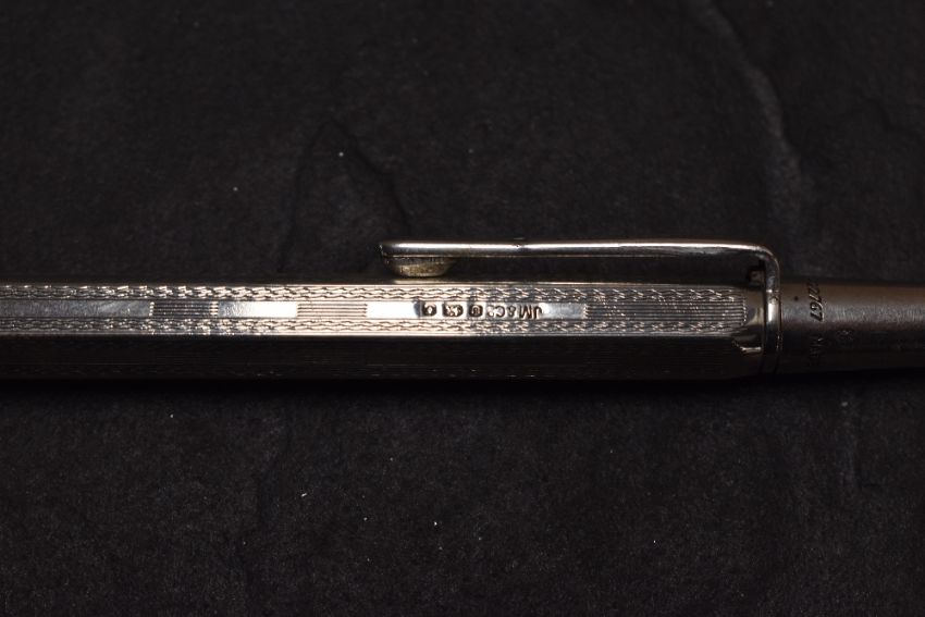 Three Yard o Led Sterling and Hallmarked Silver pencils. All hexagonal, all engine turned. Two dated London 1955 and 1959 maker Johnson, Matthey & Co. 60g. One engraved J.A.Lawrie April 1961 , some light dents