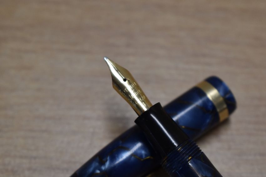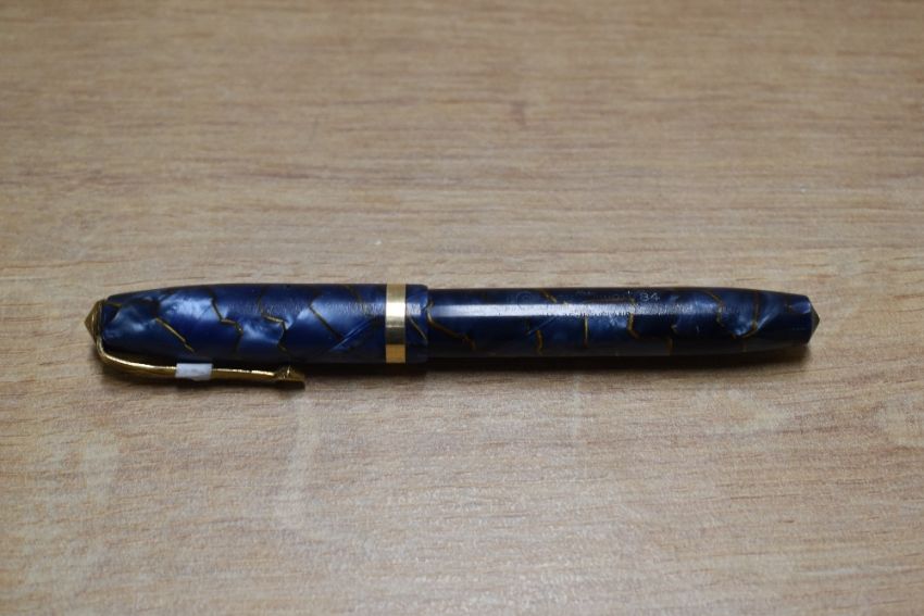 A Conway Stewart 84 lever fill fountain pen in Blue Marble with gold veins with single broad cap band having Conway Stewart 14CT Gold 4 nib. Circa 1955