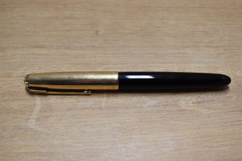 A Parker 51 aerometric fill fountain pen in Black with Gold Fill converging line cap. Circa 1950
