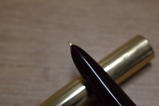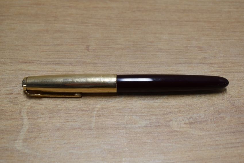 A Parker 51 aerometric fill fountain pen in Dark Burgundy with Rolled Gold converging lines cap. Circa 1951