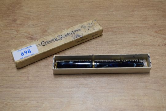 A boxed Conway Stewart 12 lever fill fountain pen in Blue Marble with Brown veining having Conway Stewart 14CT Gold 3N nib. Circa 1951