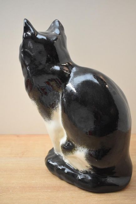 A large J Winstanley fireside Persian cat study, black and white gloss finish, having signature to underneath, measures 30cm tall. Right ear damaged and repaired.