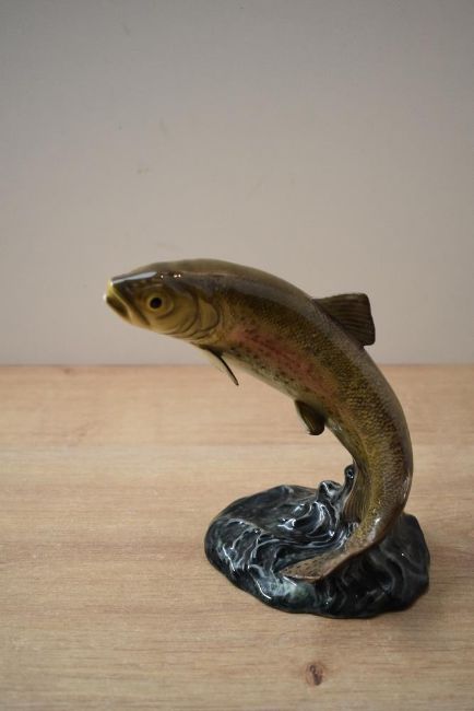 A Beswick Pottery Rainbow Trout study, model number 1032, designed by Arthur Gredington in brown and dark green gloss finish, measuring 16cm tall.