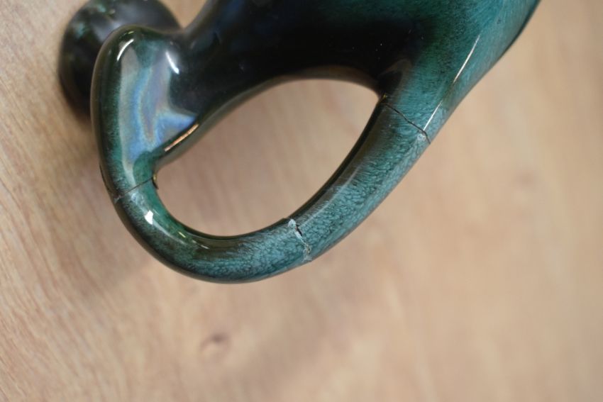 Two Blue Mountain pottery style animal studies bear and panther, measuring 13cm and 12cm tall, panther's tail has been repaired.